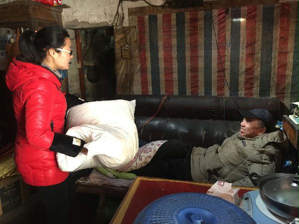 家住城北街道西浦社区老廒新村的肢体残疾人詹红虎今年65岁,平时一人生活,身体不太好且每月药费开支就要500多元,生活比较贫苦。城北街道残联非常关心詹红虎家庭,在走访慰问辖区困难残疾人活动中,看到詹大爷床上只有一床破旧的薄被子,便为他送去一床崭新的棉被。詹大爷接过残联送来的新棉被后非常感动,激动地说:“非常感谢党和政府各位领导的关心和帮助,你们就是我的亲人。”据悉,从今年1月初开始组织社区工作人员和助残志愿者对本辖区困难残疾人家庭一一走访,做好冬季物资需求摸底登记工作,全力帮助他们渡过难关。