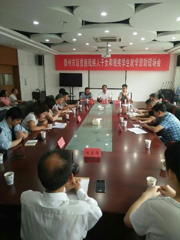 8月25日,海陵区残联组织6名贫困残疾人子女和残疾学生代表参加泰州市残联在二楼会议室召开的就学资助现场会。泰州市残联栾斌理事长和可胜科技林志彬经理向受助的贫困残疾人子女和残疾学生代表发放助学金;勉励他们要坚定信念、志存高远。砥砺意志、发愤图强,用实际行动报效祖国、回报家乡。我区王兔林代表受助学生家长作了发言。